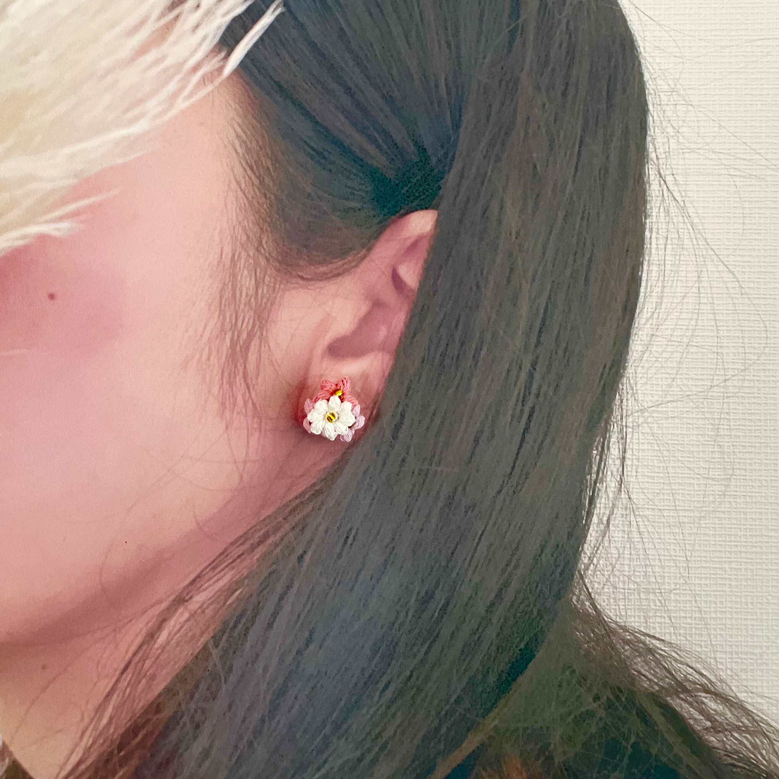 ○レースの糸をかぎ針で編んだ、小さなお花の耳飾りです。