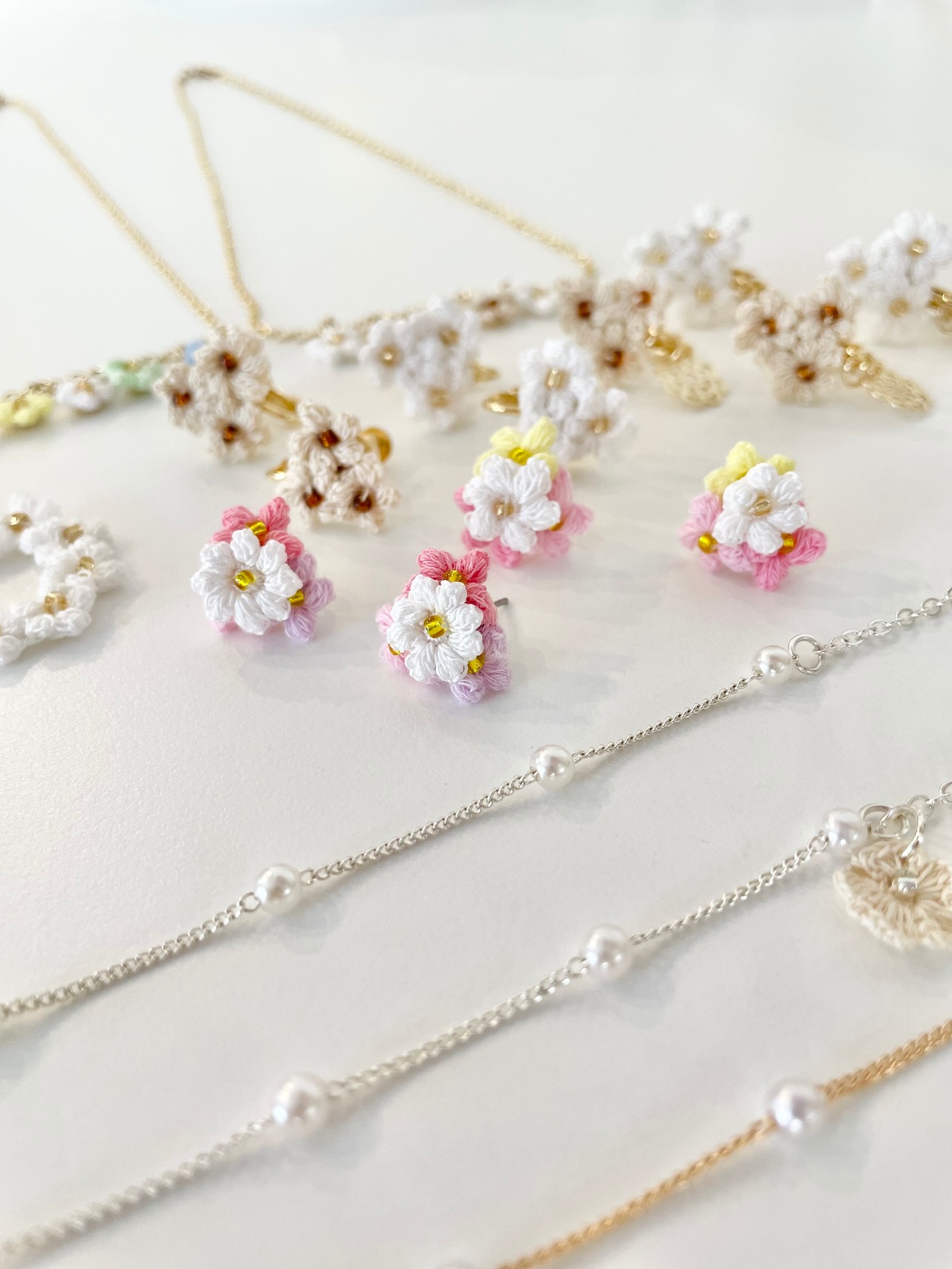 ・ひとつひとつ丁寧に作ることを心がけておりますが、レース編みアクセサリーは大変繊細です。水濡れ、汗、火器、強い衝撃、直射日光、高温等にご注意ください。