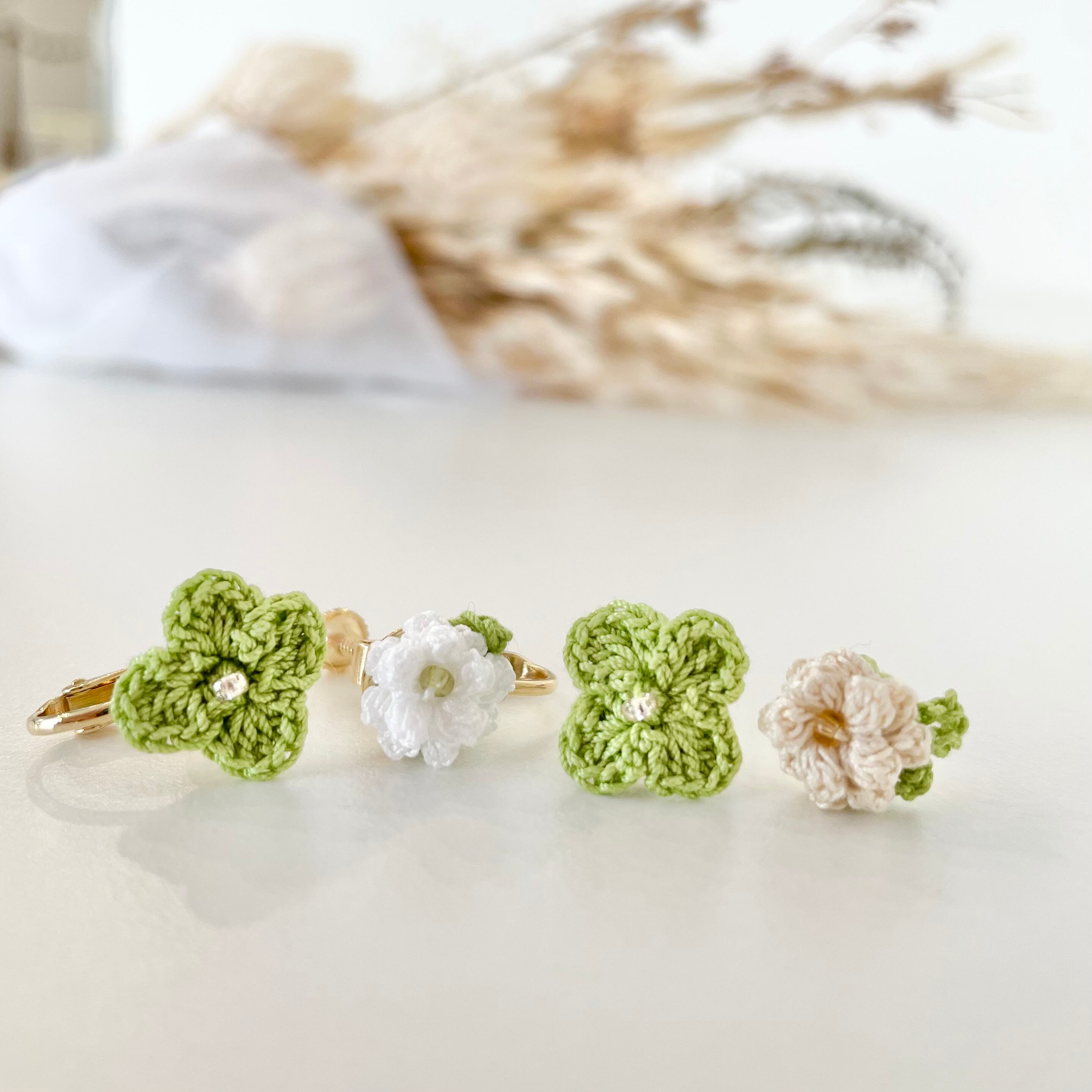 ○レースの糸や刺繍糸をかぎ針で編んだ、小さなお花とクローバーの耳飾りです。
