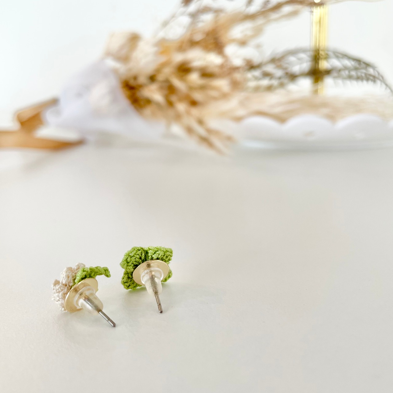 ・ひとつひとつ丁寧に作ることを心がけておりますが、レース編みアクセサリーは大変繊細です。水濡れ、汗、火器、強い衝撃、直射日光、高温等にご注意ください。